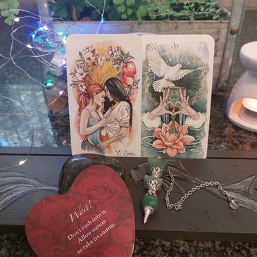 During the personal tarot and pendulum reading, you will participate in a visual meditation tailored from your cards to help you deepen your understanding of the reading. This experience provides a sacred space to explore your questions. Done virtually via WhatsApp video call.